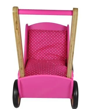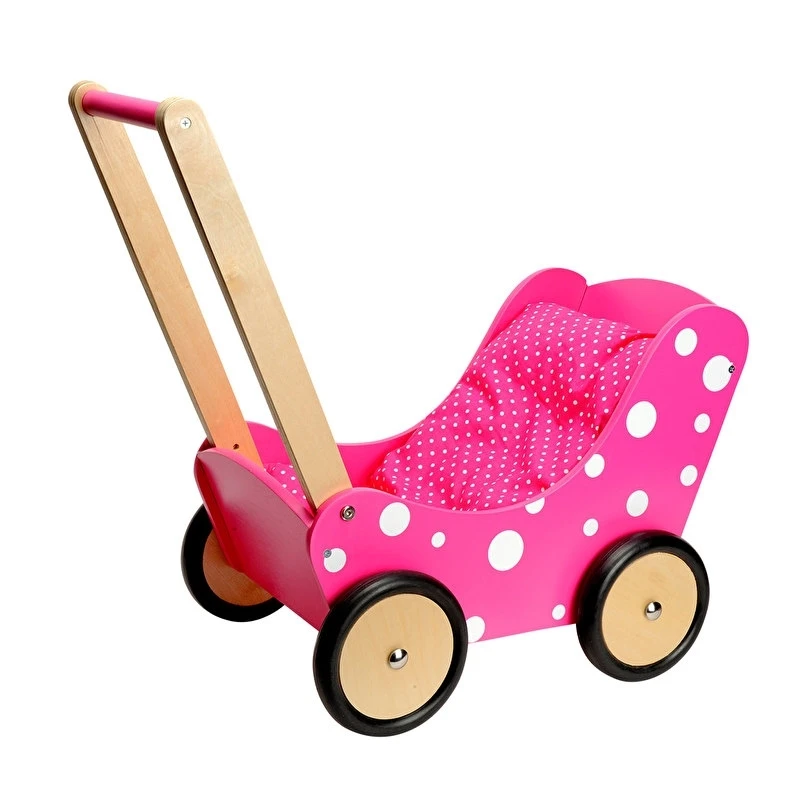 Vrolijke houten poppenwagen, rose met witte stippen, inclusief bijpassend poppendekentje. Met duwstang en rubberen wielen.