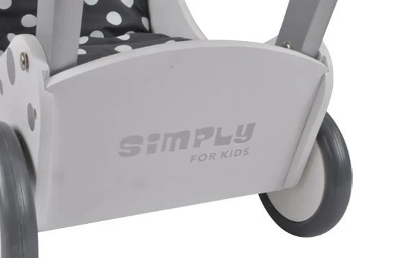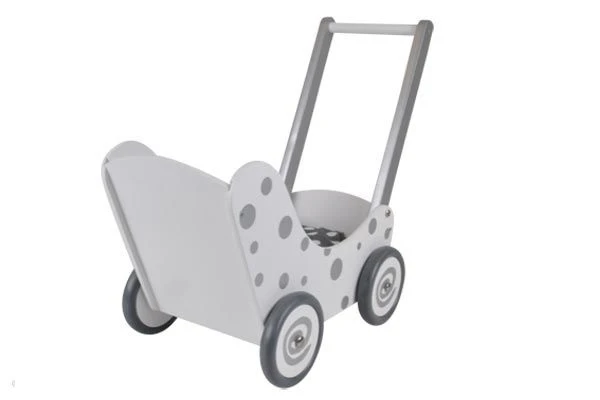 Vrolijke houten poppenwagen, wit met zilveren stippen, inclusief bijpassend poppendekentje. Met duwstang en rubberen wielen.