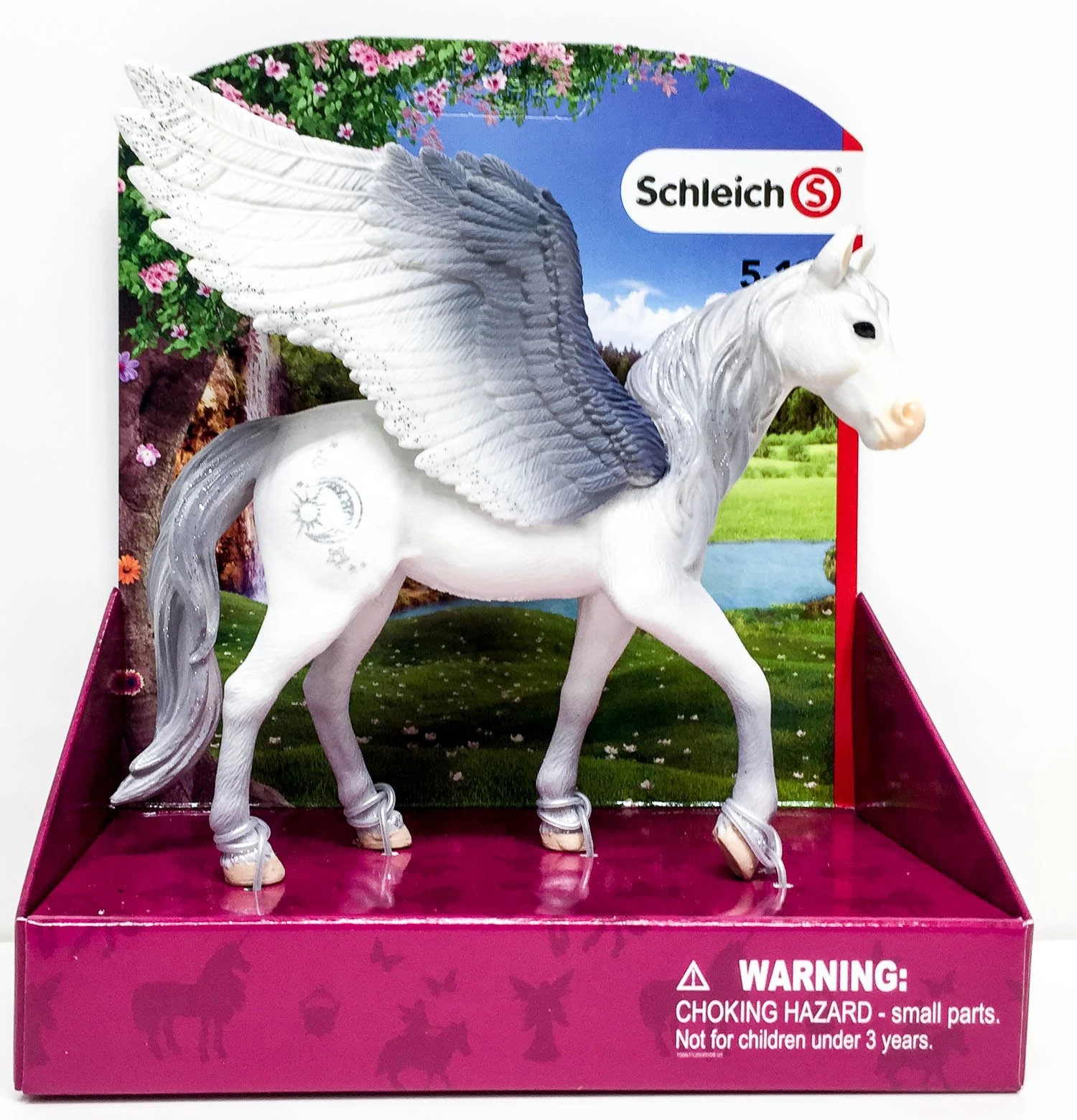 Nog één flap van de vleugel, dan stijgt het vliegende paard van de grond en verdwijnt al snel met een glinsterende streep aan de horizon. Geen enkel ander wezen in Bayala vliegt zo hoog en zo snel als een Pegasus. En bijna geen enkel schepsel is zo nobel en mooi. Als je hem in de lucht ziet, ziet hij eruit als een sprankelende ster. Bijna nooit eerder heeft hij een elf op hem laten rijden. Alleen de uitverkorenen kunnen op zijn rug gaan zitten en onvoorstelbaar snel van de ene plaats naar de andere komen. Je kunt een Pegasus niet als een paard temmen, maar je kunt wel zijn vriend worden.